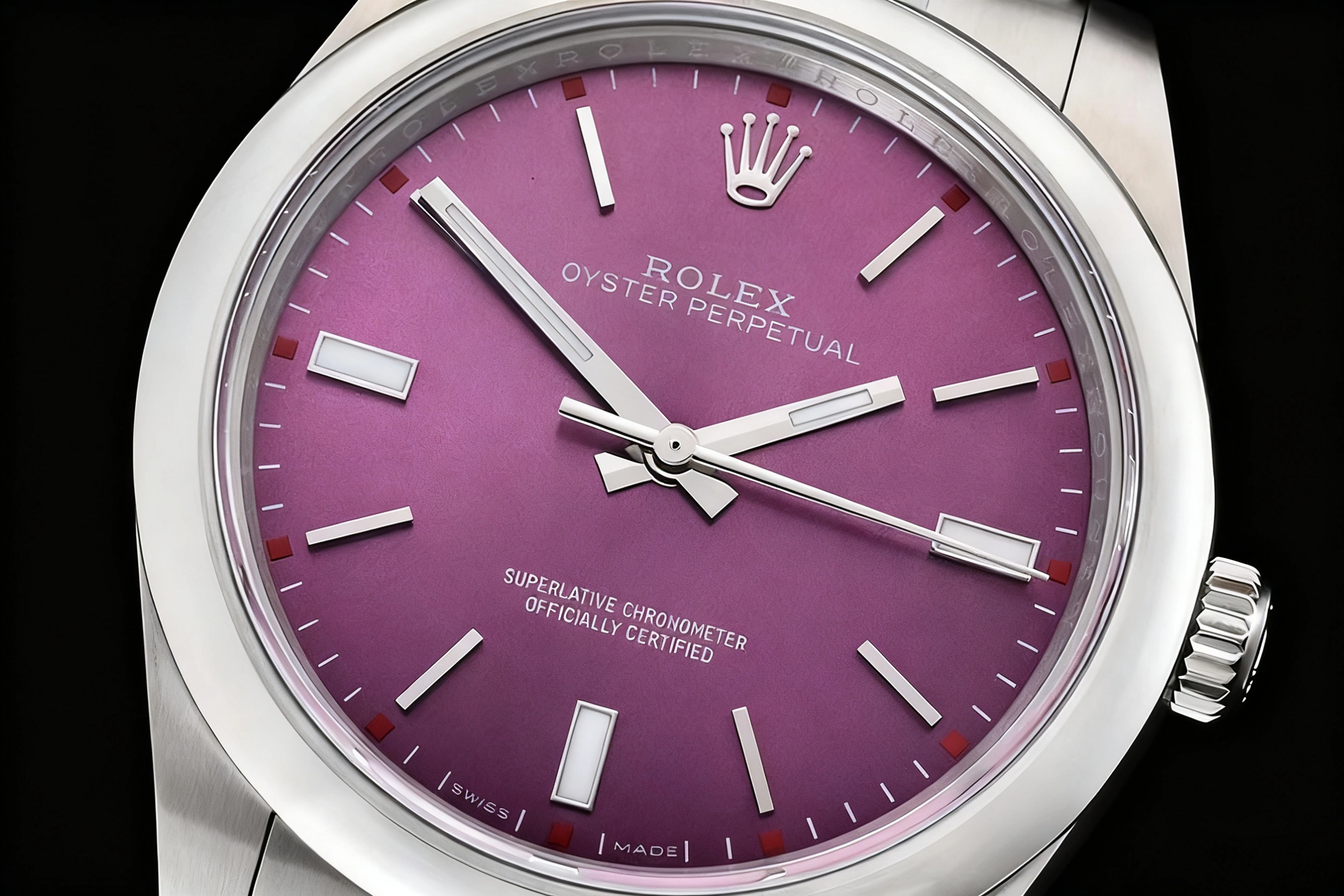 DIAL COLOR: Red Grape Dial with Stick Markers (With Swiss Grade Superlume in Blue)