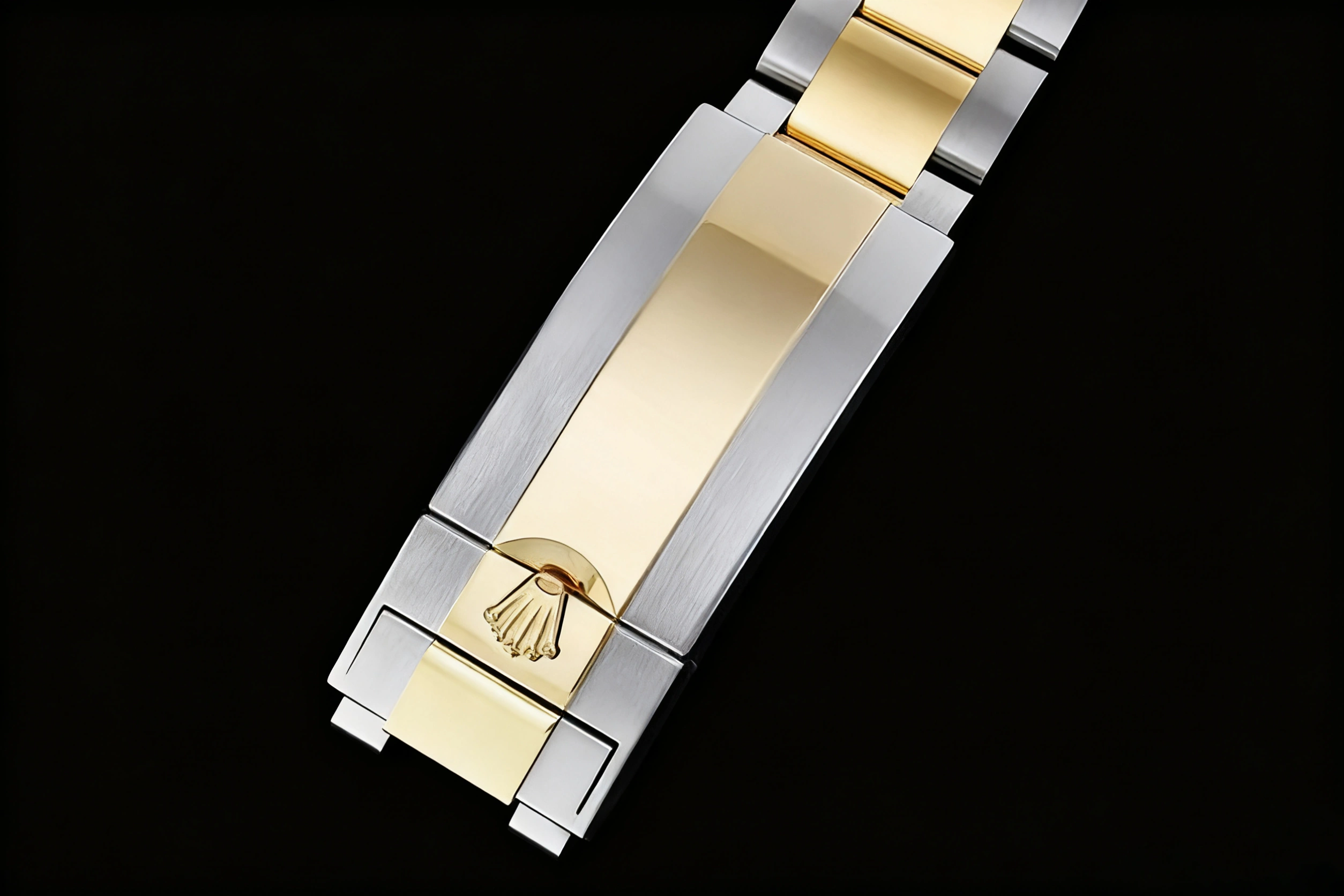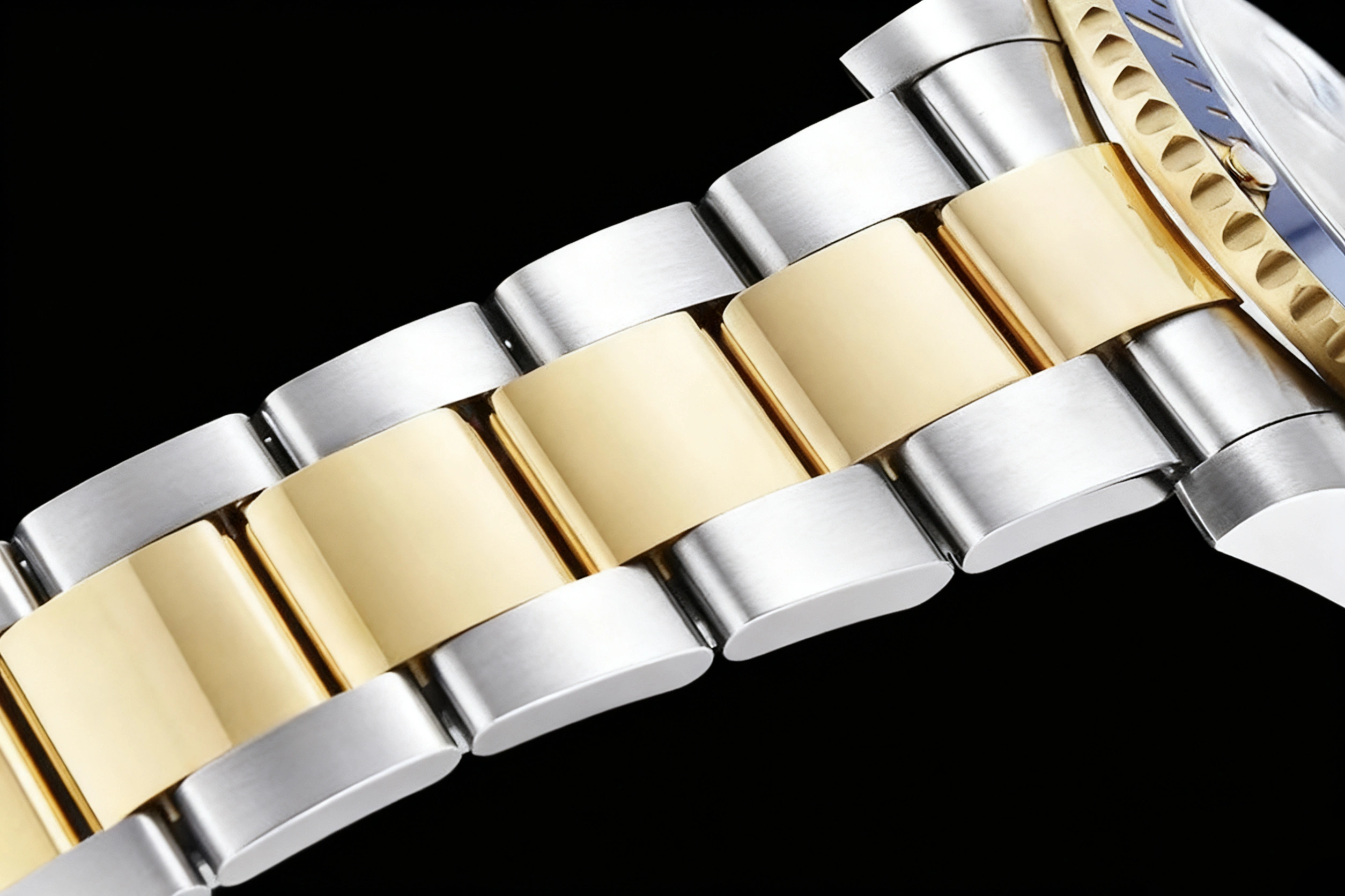 BRACELET: Two Tone 18K Yellow Gold Thick Plated (5 mils) on Solid Stainless Steel 904L with Flip Lock Deployant Buckle (Midlinks sides are also plated with gold)