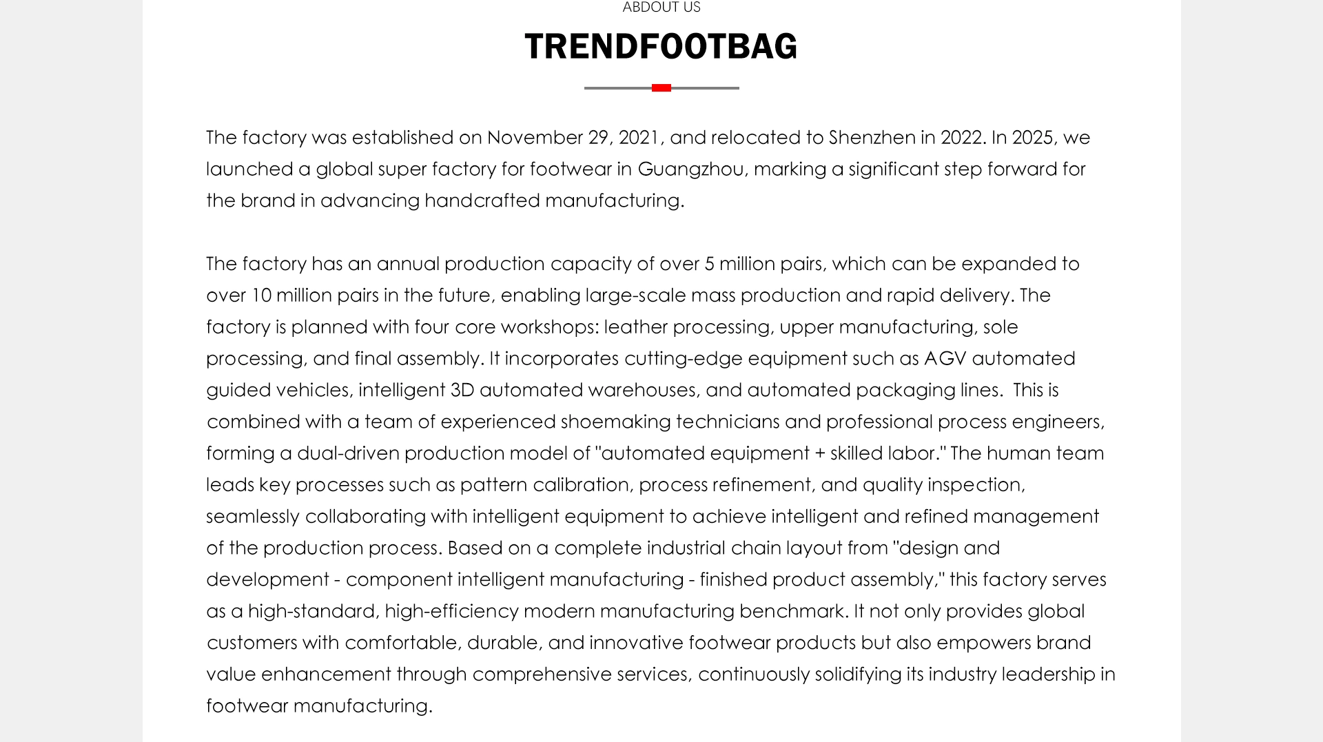 Trendfootbag is the largest shoe manufacturing factory in Asia, specializing in high-end brands. With a 13,000 square meter factory and over 500 skilled employees, we are committed to producing high-quality, comfortable shoes that everyone can afford....