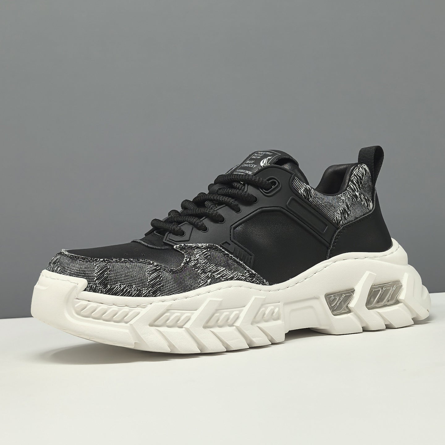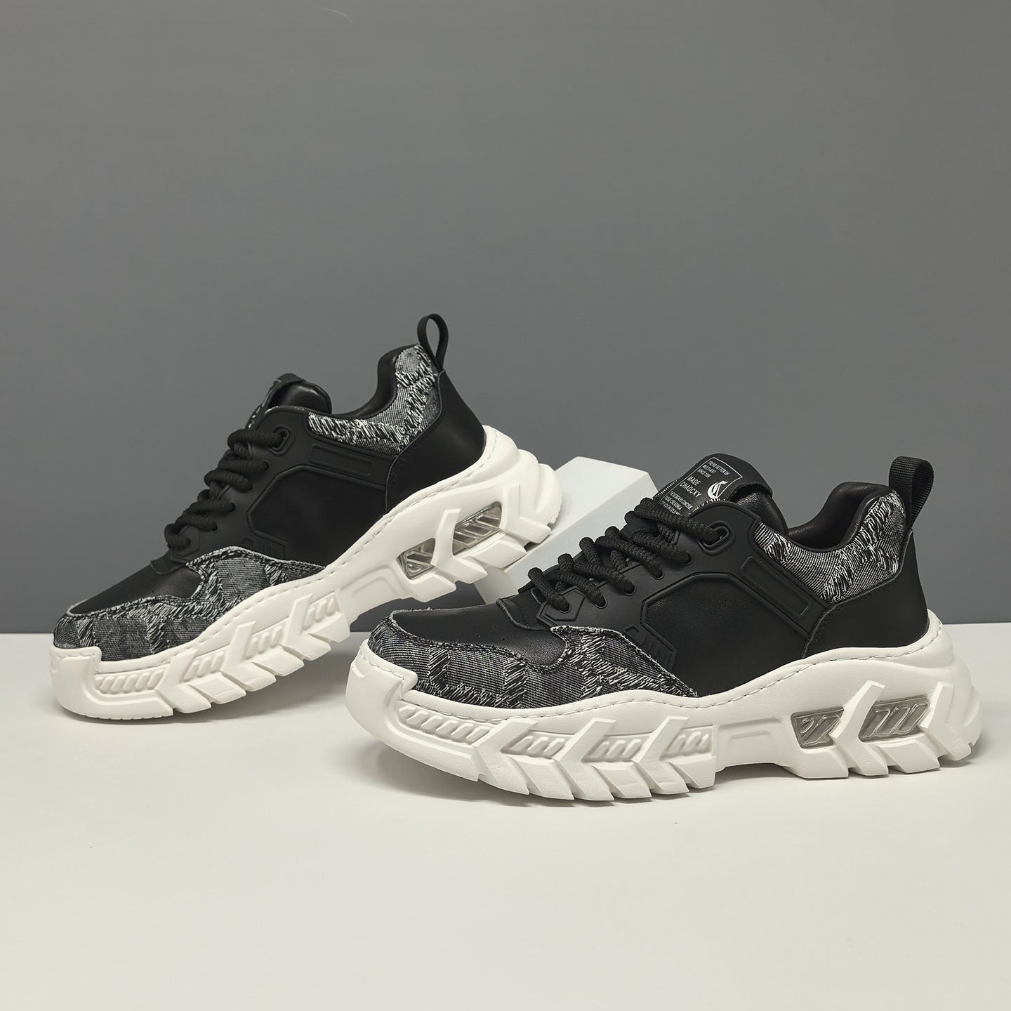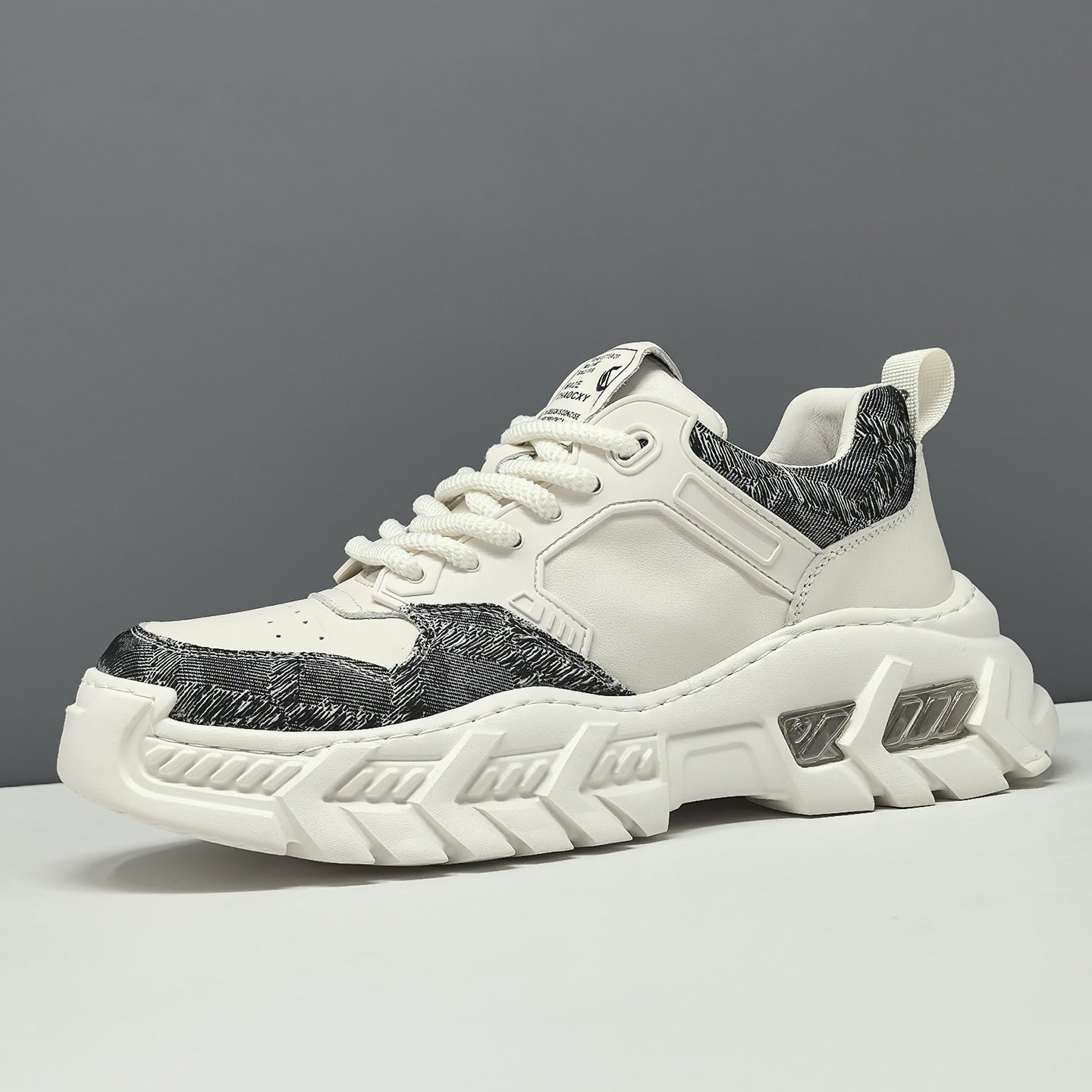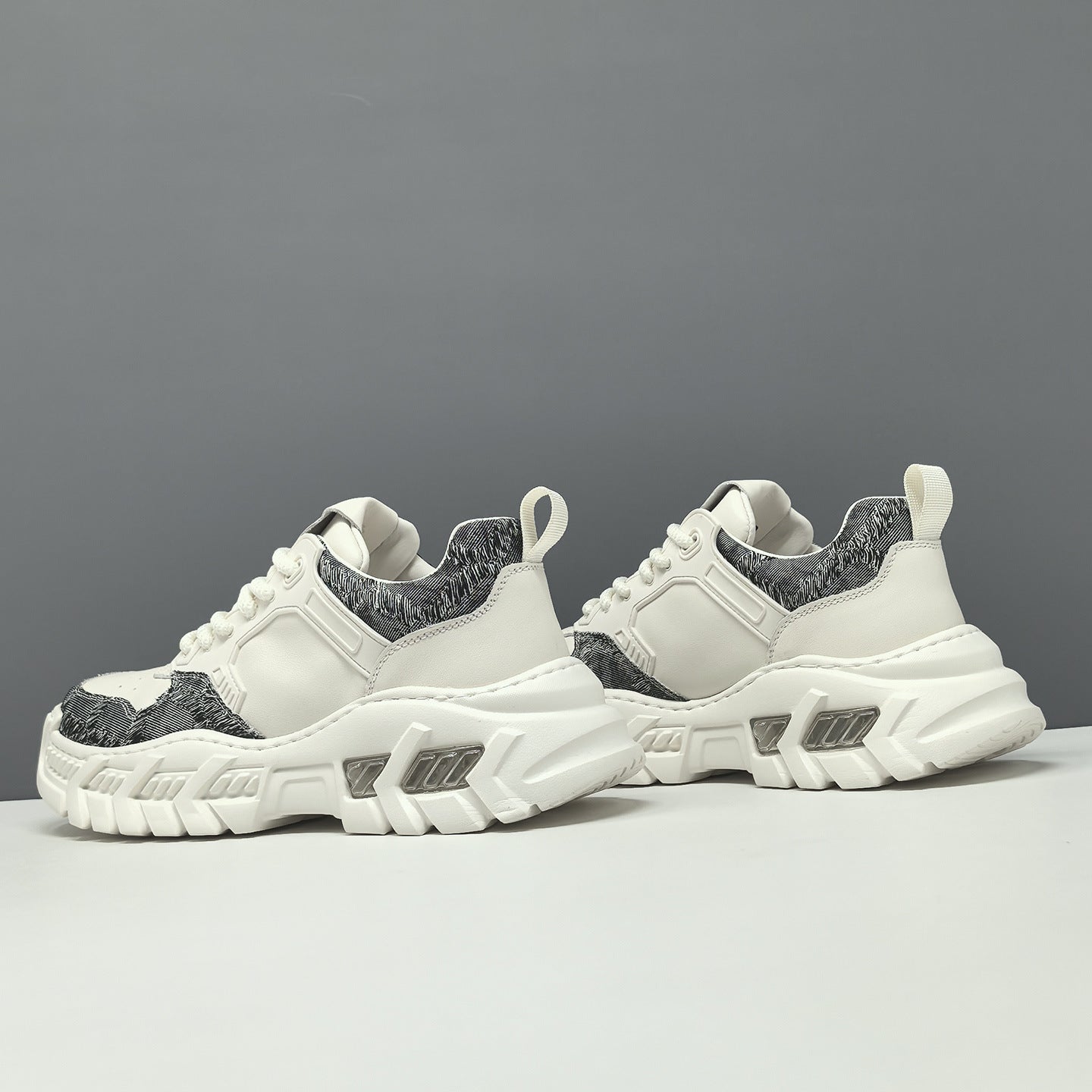 Men's Leather & Fabric Chunky Dad Sneakers. Crafted from top - grain leather + fabric, they feature a lace - up design, a 3cm rubber - foam platform sole, and top - grain pigskin + mesh lining for breathability. The color - blocked style makes them ideal for casual and sporty spring - autumn styling.