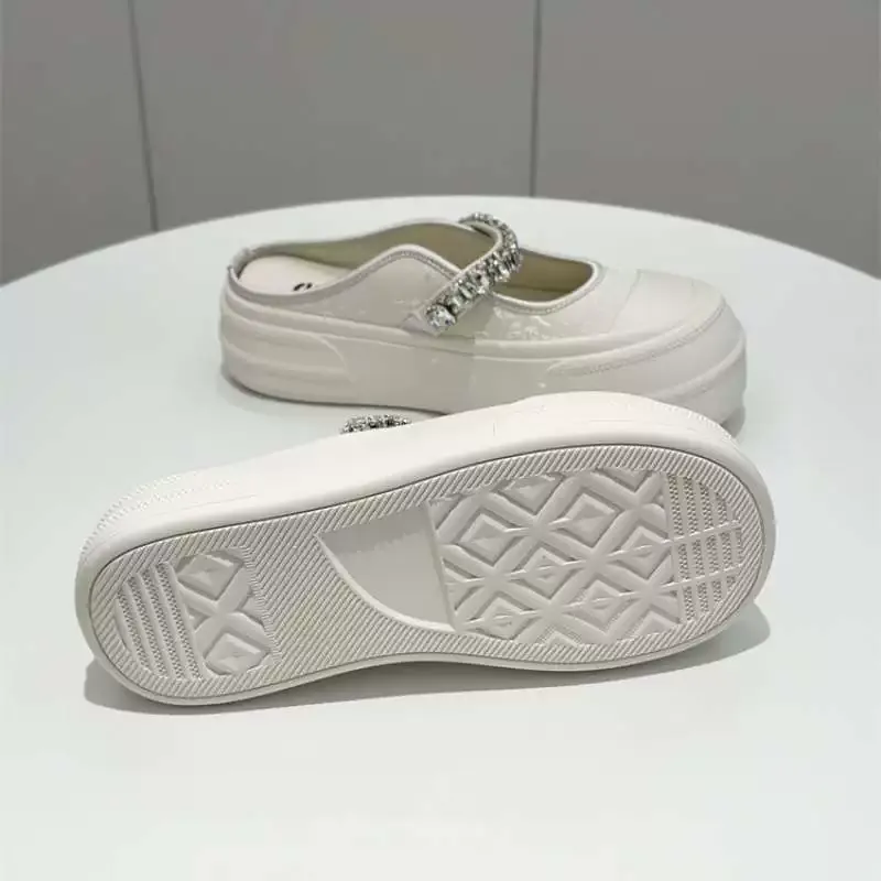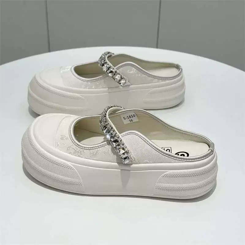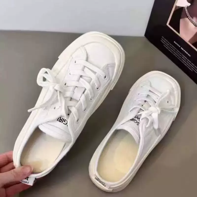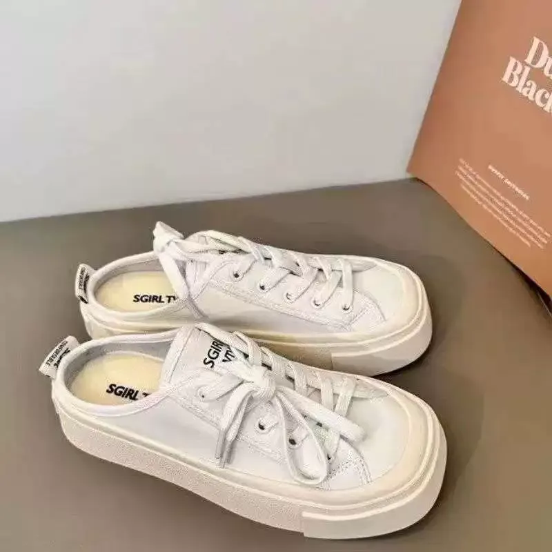 Women's half-slip-on canvas shoes, 2025 new spring/summer style, thick-soled casual sneakers, easy-to-wear white sneakers.