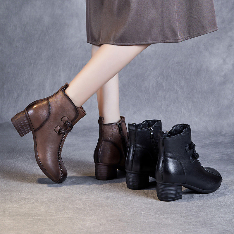 Women's Vintage Plain Leather Low Block Furred Ankle Boots