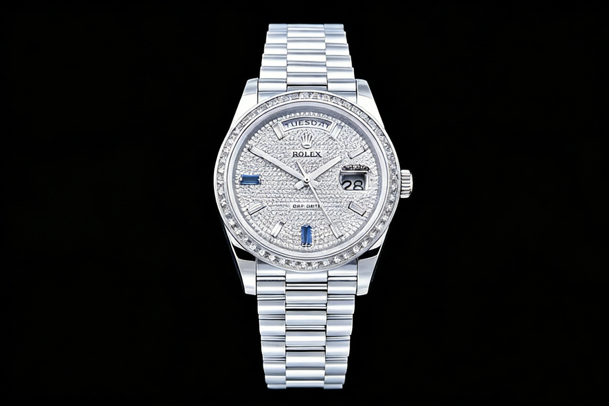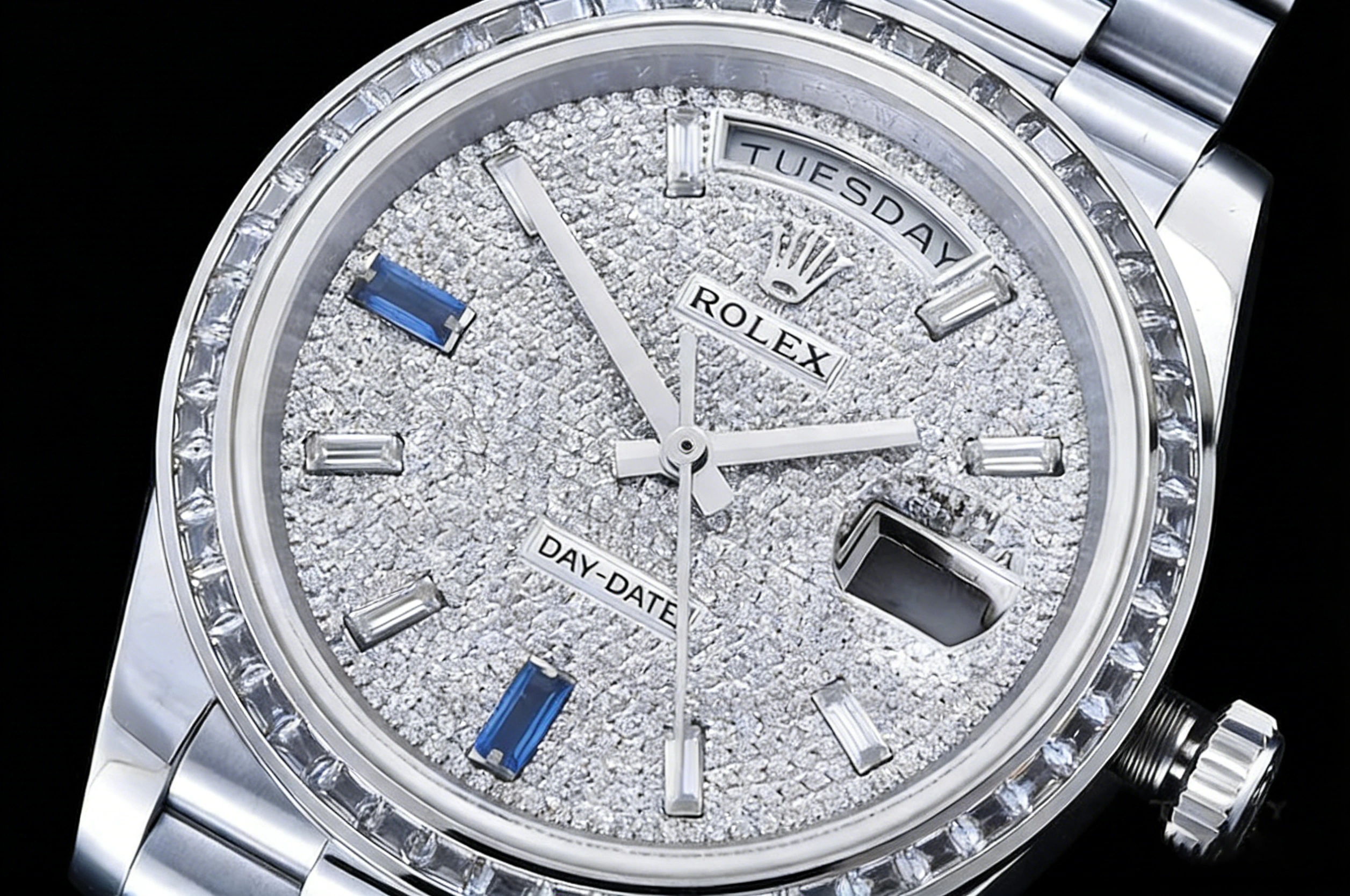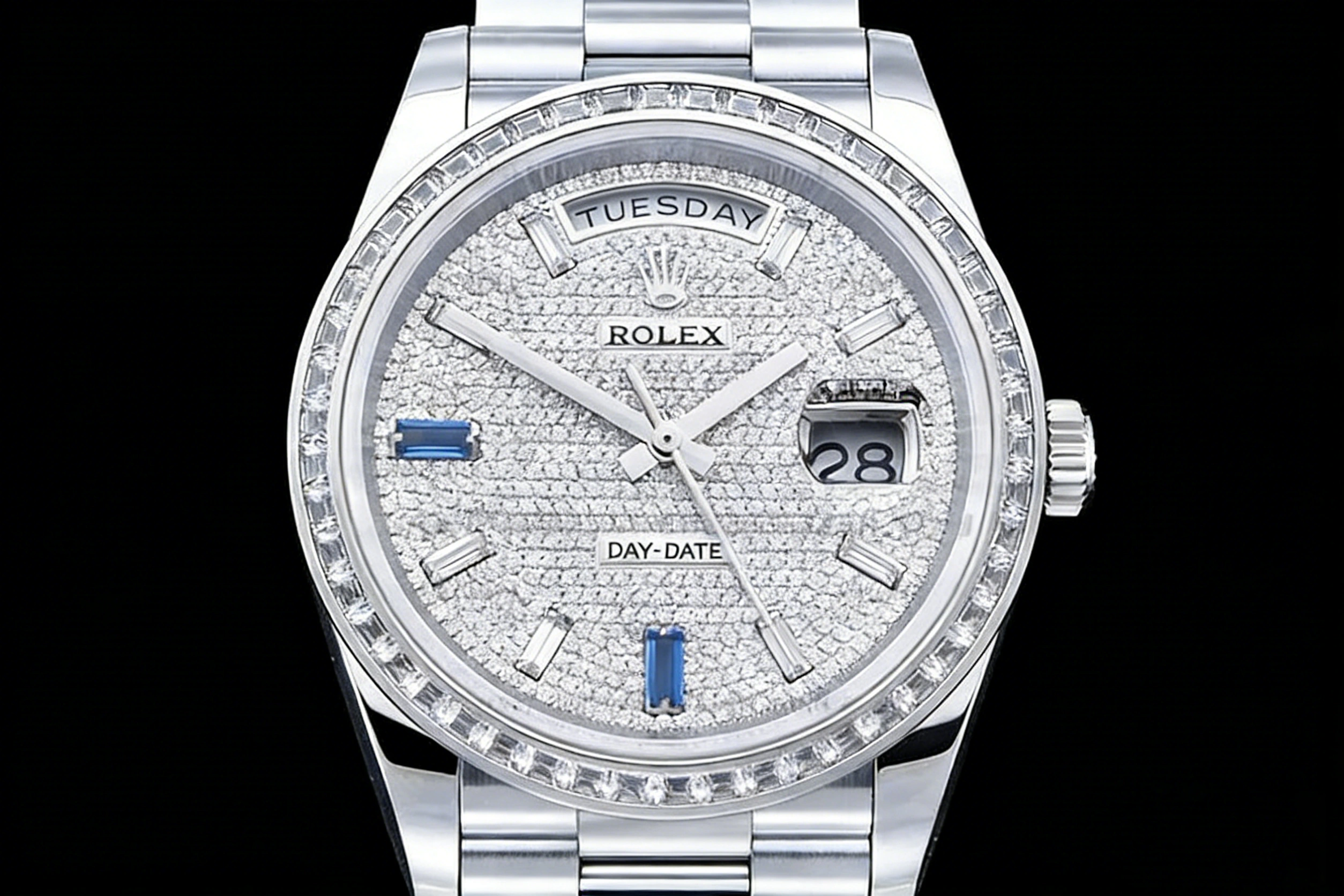 DIAL COLOR: Diamond Paved Dial with Diamond and Sapphire Markers